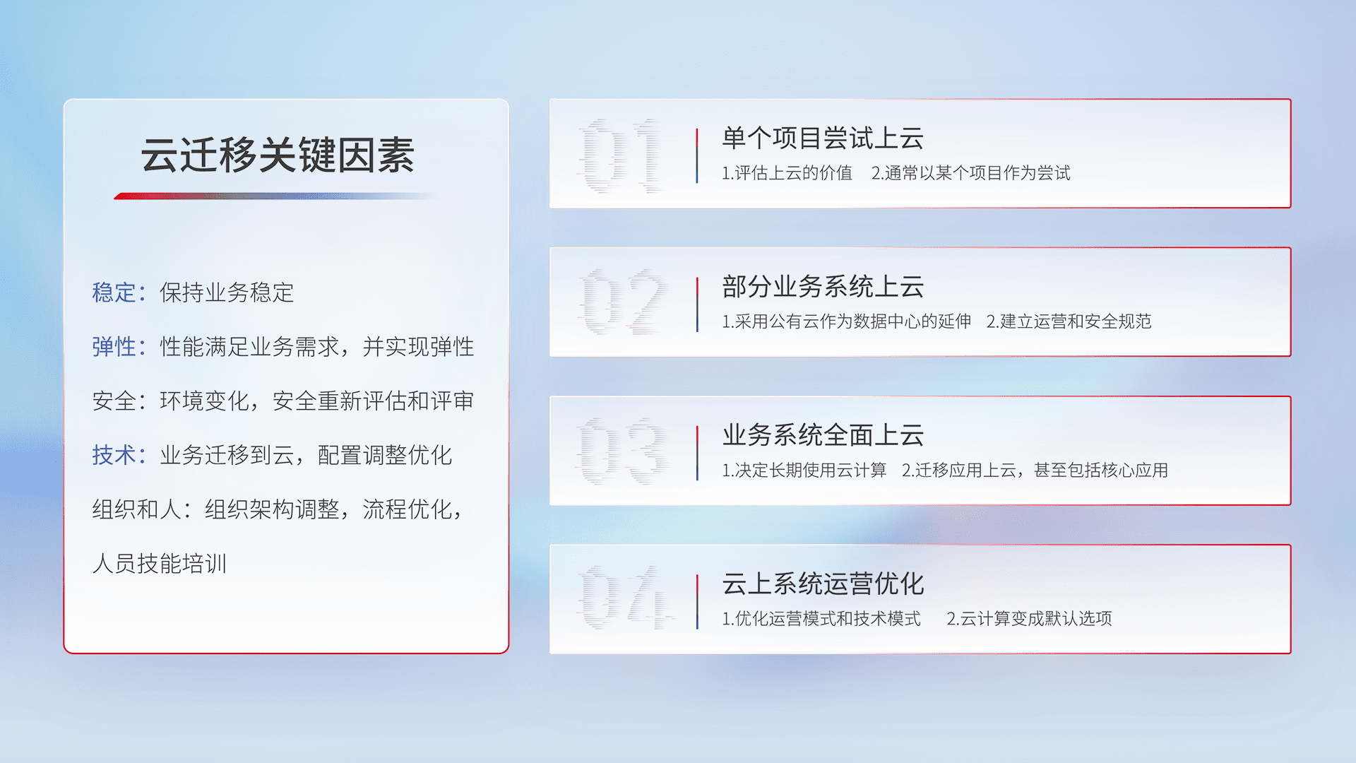 结合实际业务,,从规划设计、、、、云平台选型、、、云原生改造、、数据迁移、、、集成交付,,,迁移全过程为客户识别最佳上云路径,,,做好风险识别管理,,,,设计网络架构、、身份权限、、安全审计合规、、、、操作审计、、日志审计、、监控告警策略、、多站点容灾设计等,,对云上基础设施进行整体规划,,,,提升IT治理水平,,以满足弹性、、高可用、、高性能的需求。。。。
