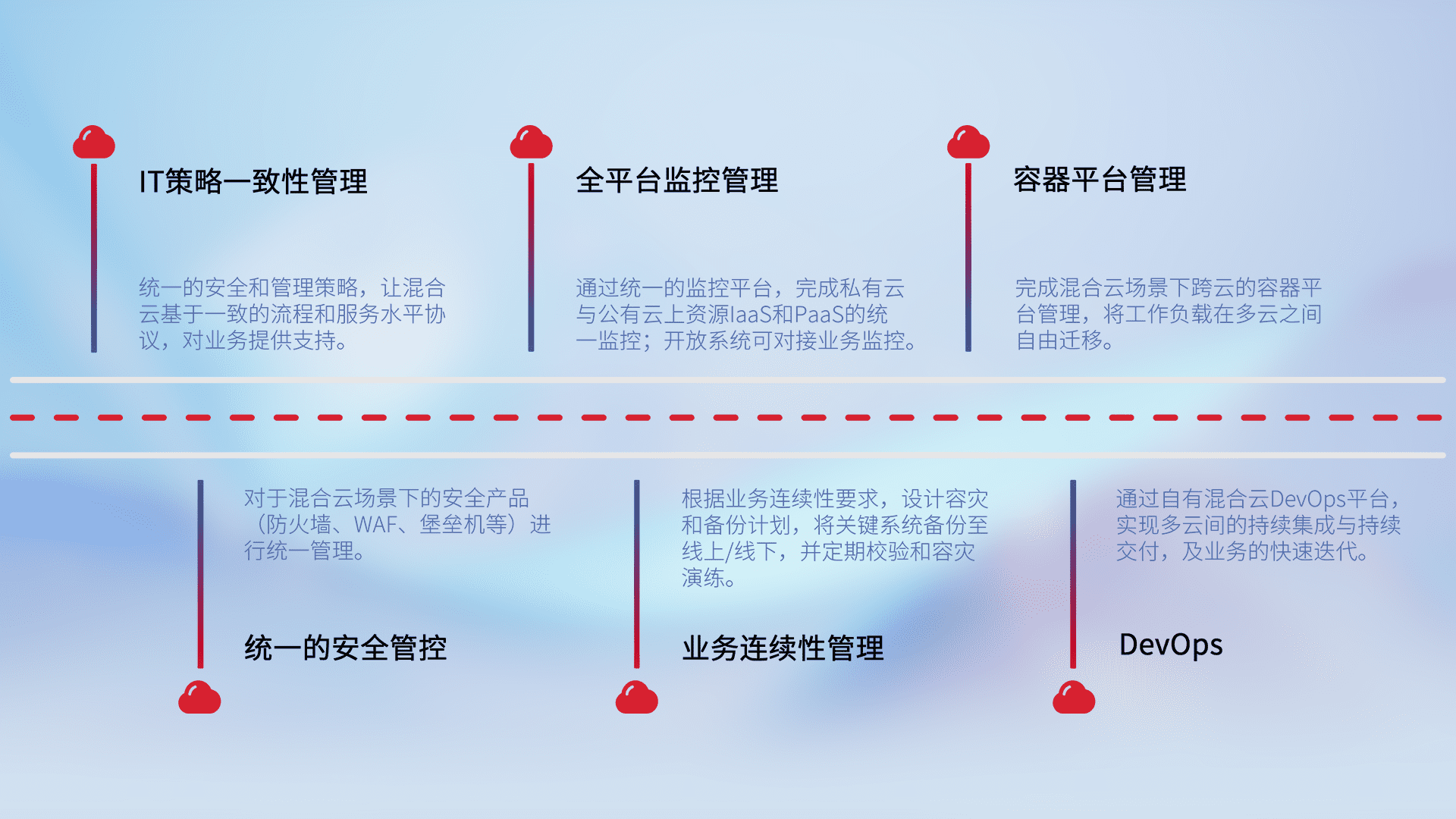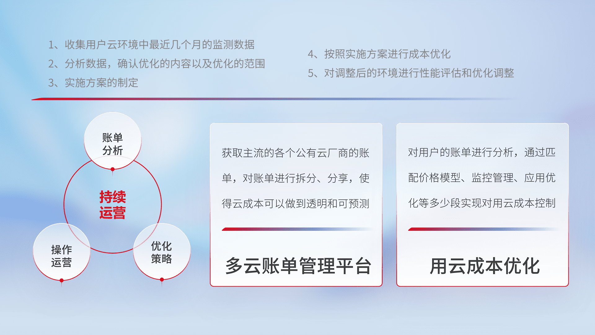 通过多云纳管,,,以统一的资源数据模型把客户的云资源进行抽象和封装,,进而实现对多云资源的统一操作,,,保障云资源管理的可靠性、、稳定性与可用性。。量身定制化运维内容,,,,配置、、、、开发运维、、、、补丁管理、、备份、、、、监控、、、、认证和访问管理、、、审计和日常巡检等,,保障在用云过程中的可靠度,,稳定度以及高可用率。。。