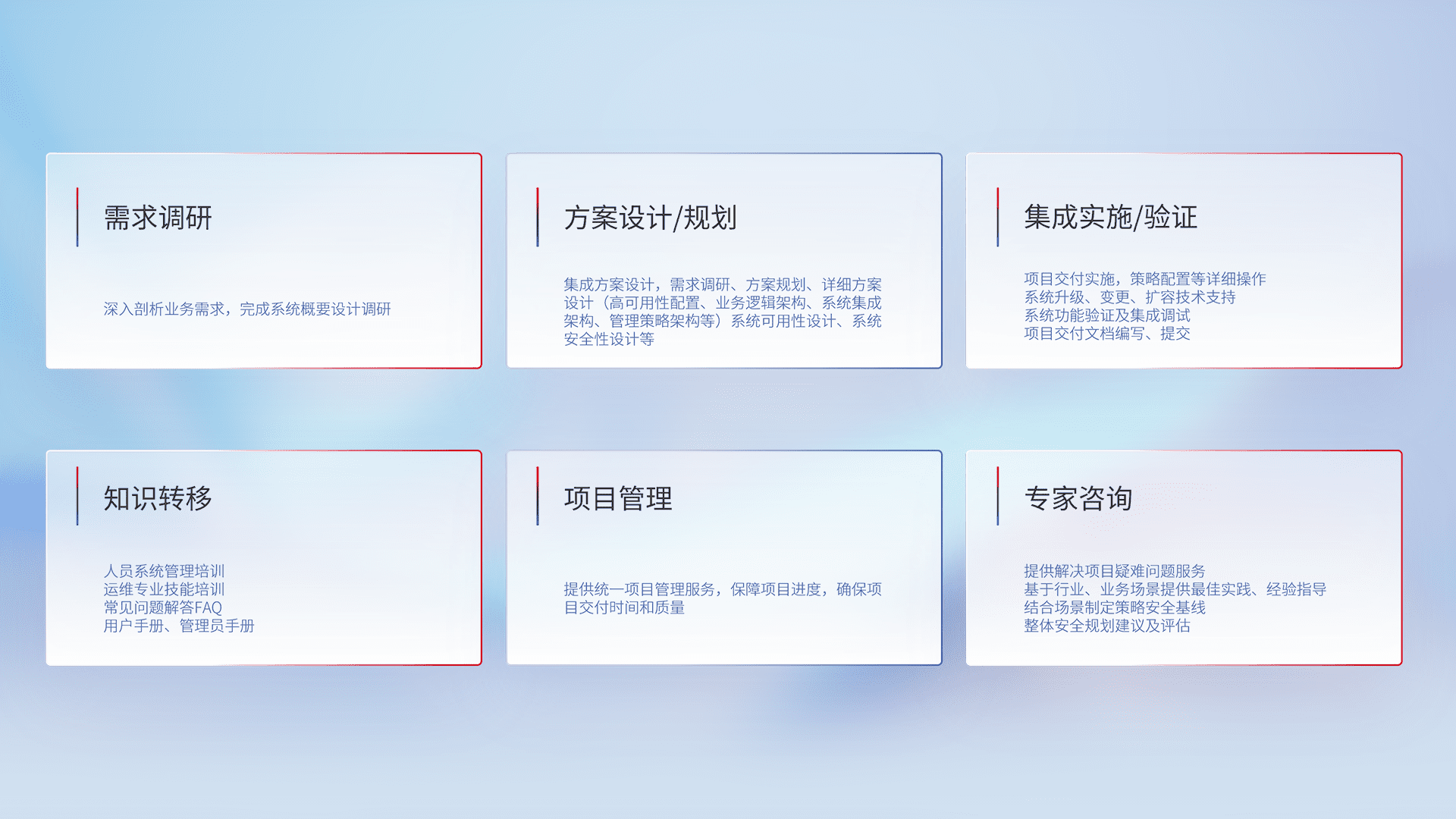 针对客户行业特性,,将宏观的安全战略和需求,,,,通过专业的交付服务,,,,实现项目落地,,,为客户提供标准规范的集成交付服务。。